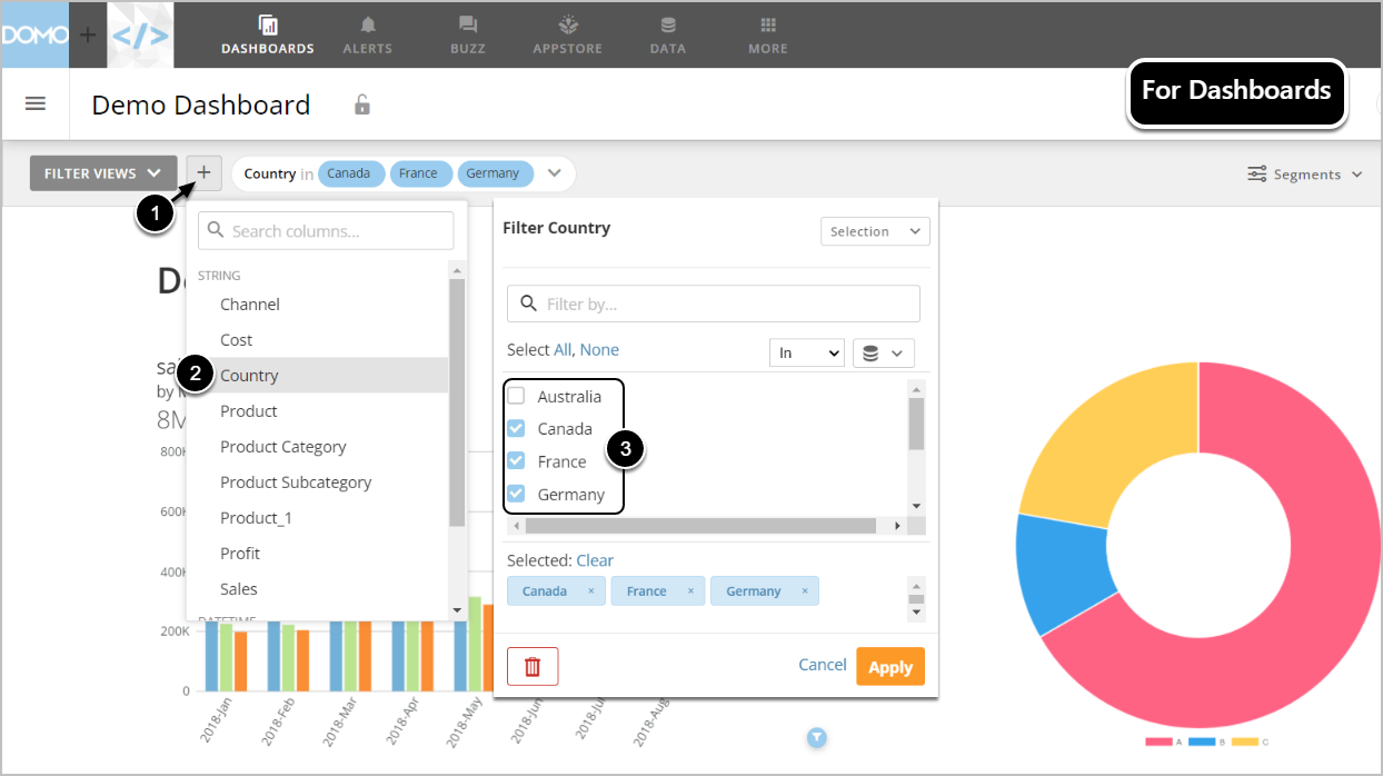 NOTE: Dimensions used here must have Values that exactly match the Filter Values in Domo (if the Values do not match, the Filter will not work).