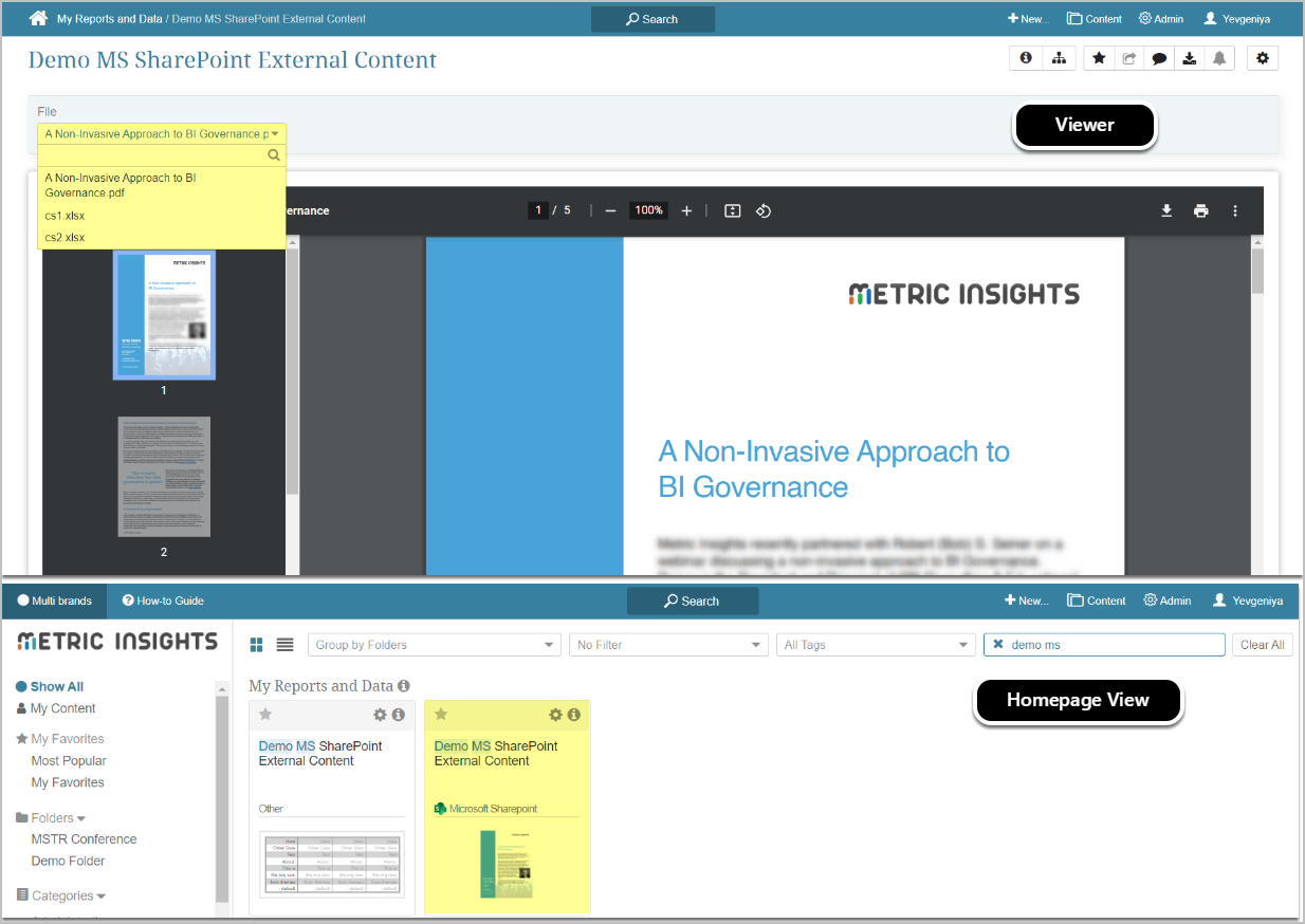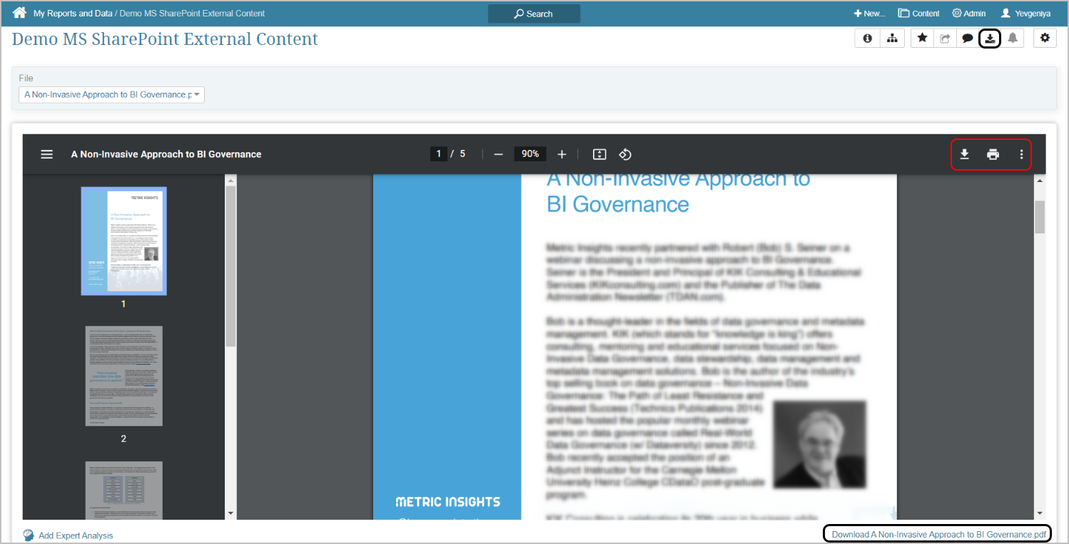 NOTE: In this example, the download controls in black boxes are native to the Metric Insights system, while the controls in a red box are native to PDF and are not controlled by Metric Insights.