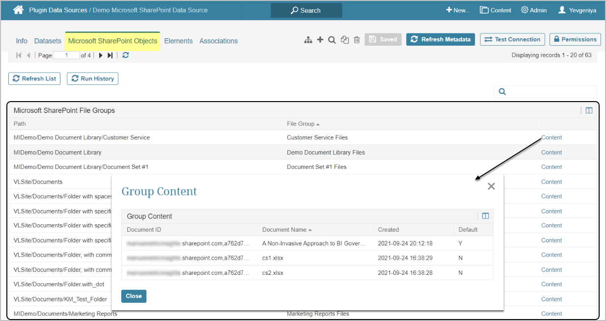 Once objects are collected, the Microsoft SharePoint Objects Tab will include an additional grid displaying Microsoft SharePoint File Groups as exemplified below. Clicking the Content button with display the contents of the Group.