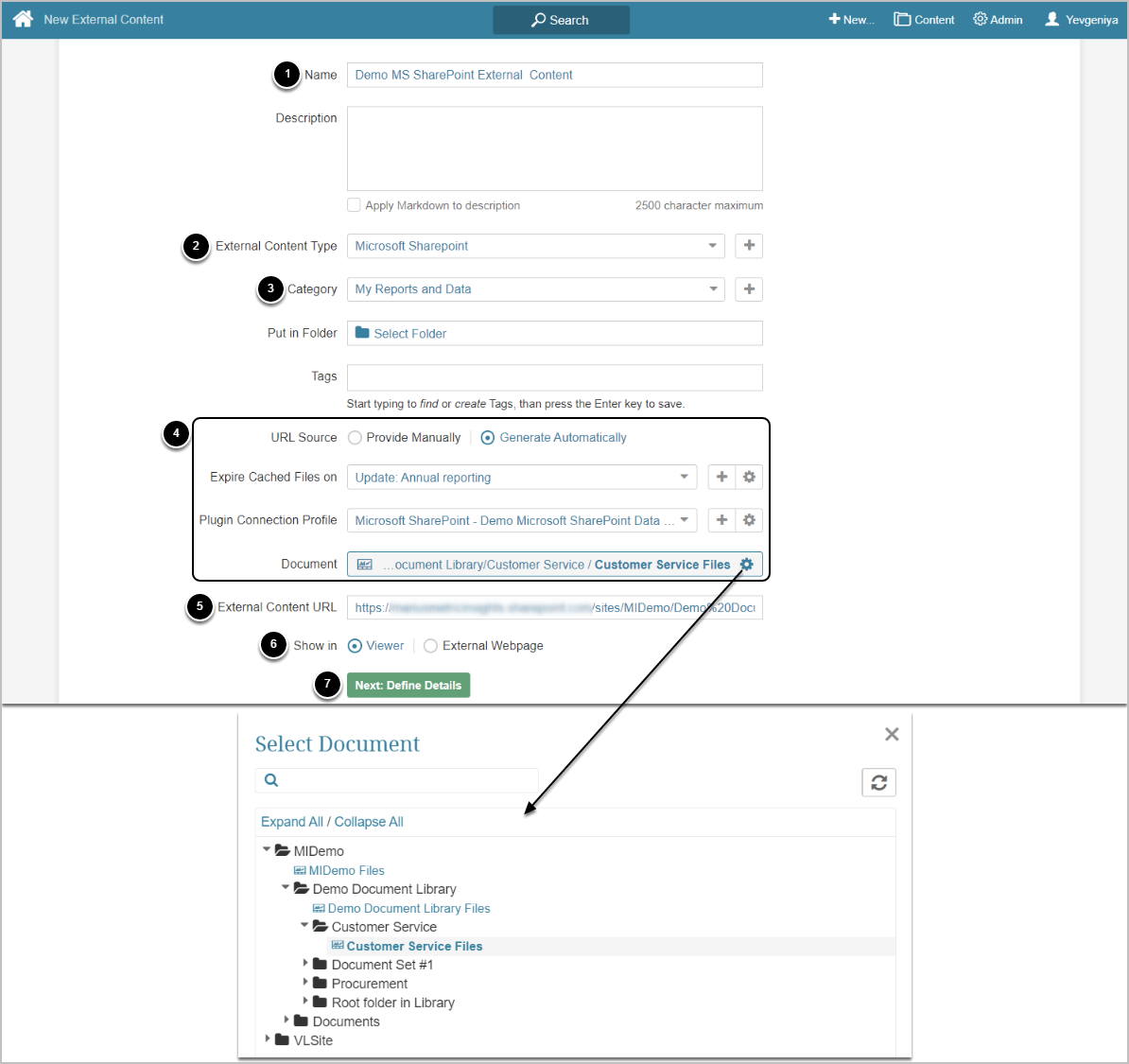 File Groups work based on folders that exist on the Microsoft SharePoint/the user's local file system side by mirroring them and their contents. File Groups can be selected as an object for Other External Content creation. Files from the selected group will then appear in the drop-down in Other External Content Viewer, with the most recent file at the top of the list.