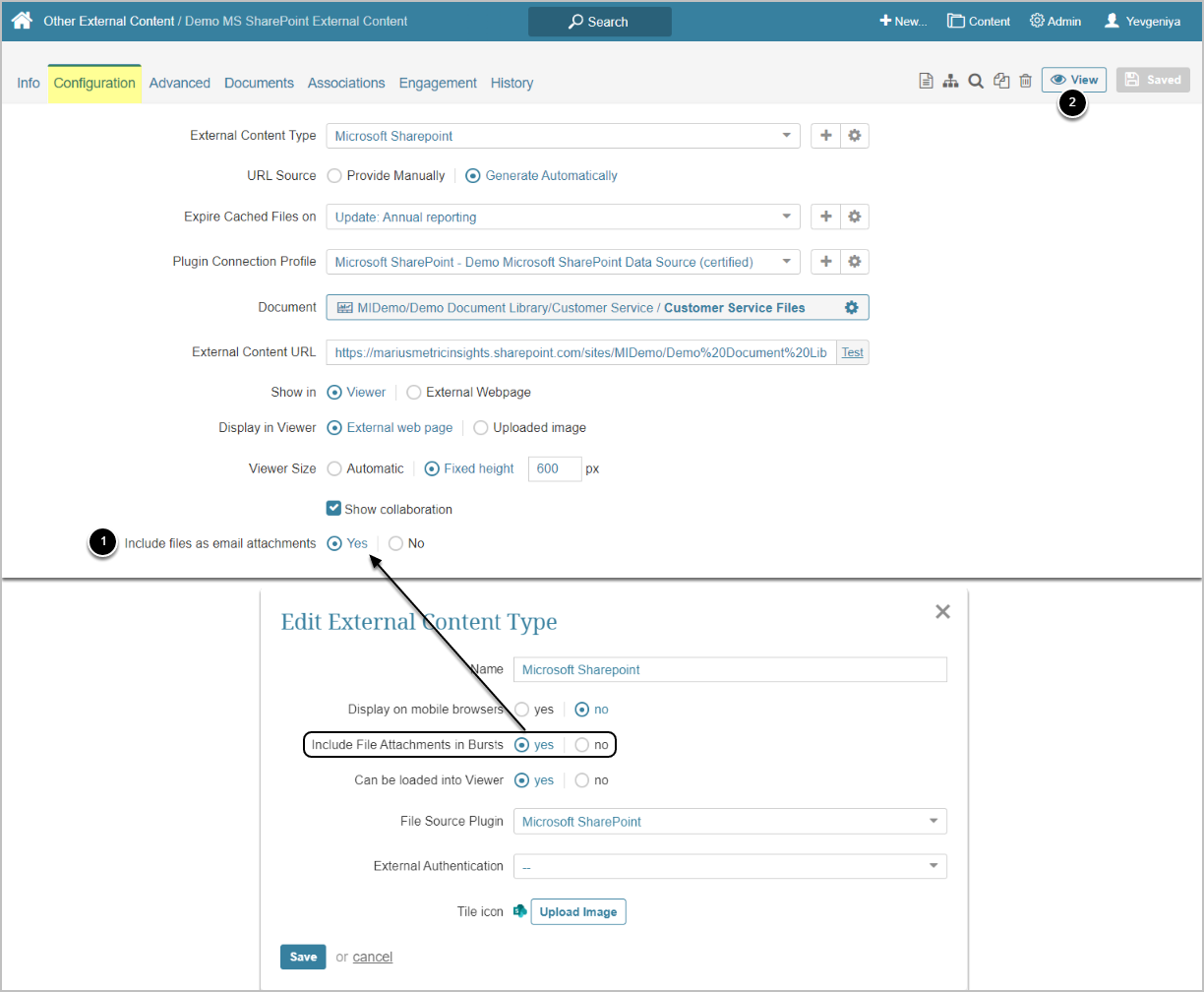 - Specify if you want to receive files as attachments to Bursts. Metric Insights will email the most recent file from File Group.- NOTE: In 6.3.2a, the display of this option is controlled in External Content Type Editor.