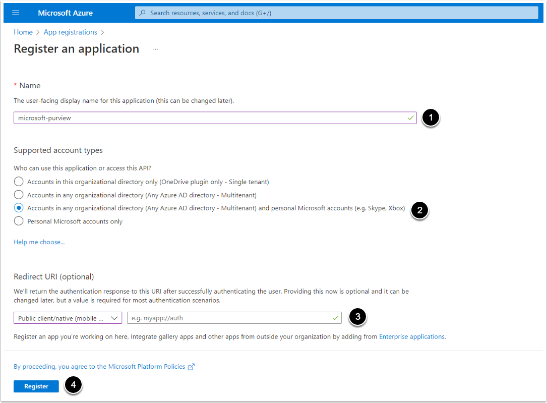 - Supported account types: Select the "Accounts in any organizational directory (Any Azure AD directory - Multitenant) and personal Microsoft accounts (e.g. Skype, Xbox)" option