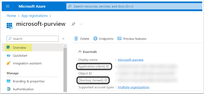 The Application (client) ID and Directory (Tenant) ID that are necessary to establish connectivity between Metric Insights and Microsoft Purview can be found in Essentials section.