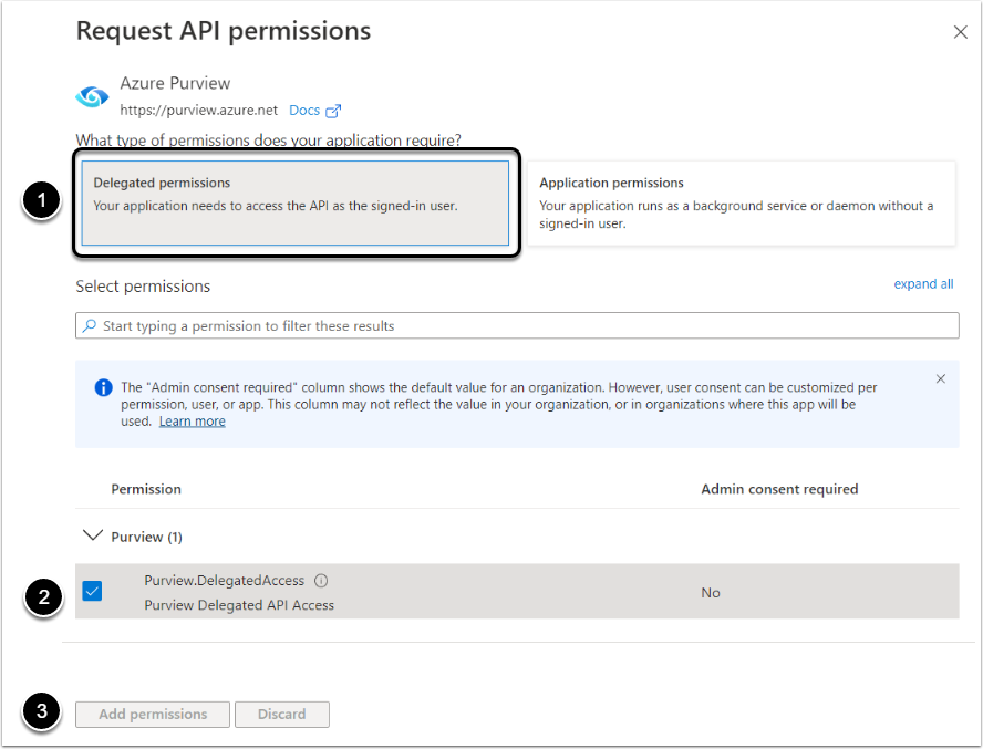 - Activate the checkbox in the Purview.DelegatedAccess row
