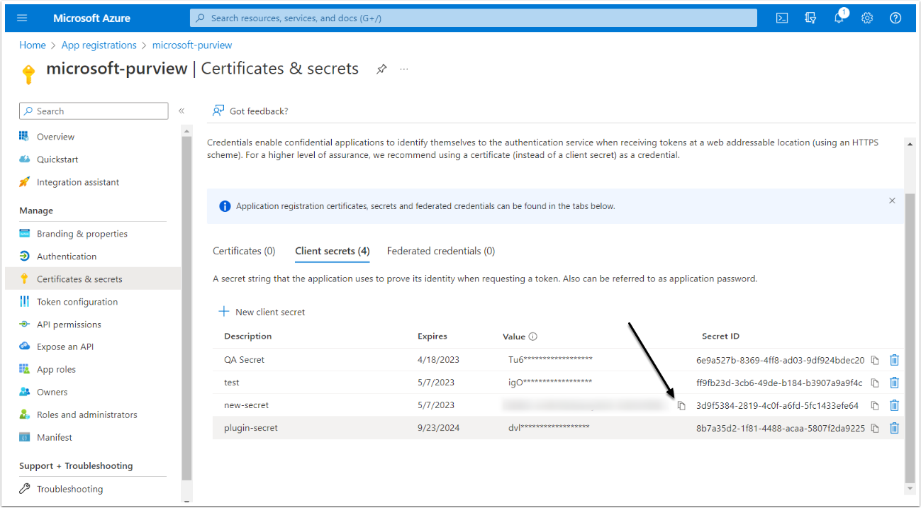 Click the "Copy to clipboard" icon to copy the secret's Value. Save it for the Metric Insights Data Source creation process.