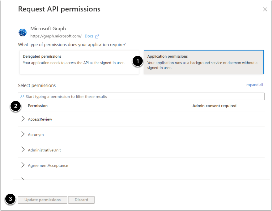 - Click the Application permissions option
