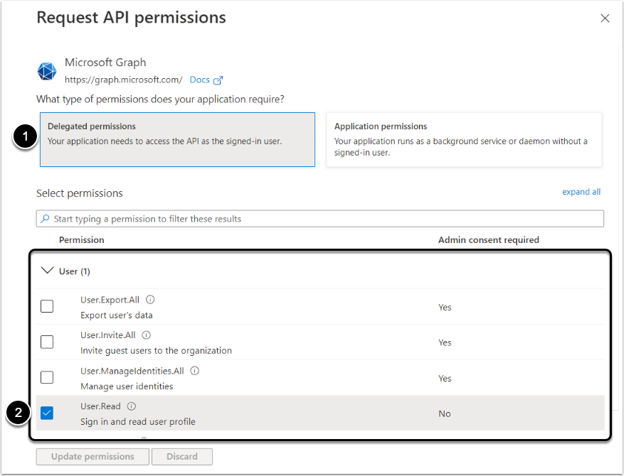 - Find the User section and activate the checkbox in the User.Read row