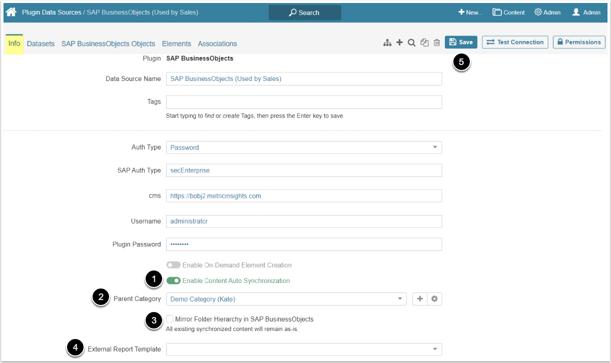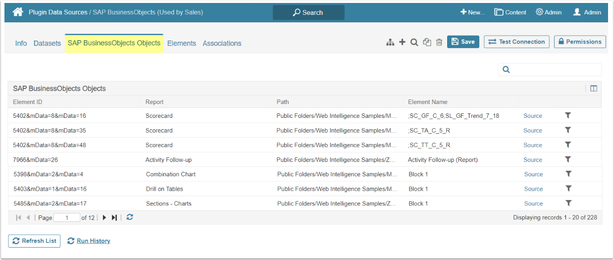 Access Admin > Collection & Storage > Data Sources and click the SAP Business Object Data Source Active Name link to open the Data Source Editor