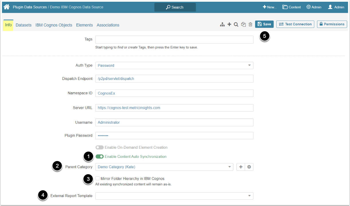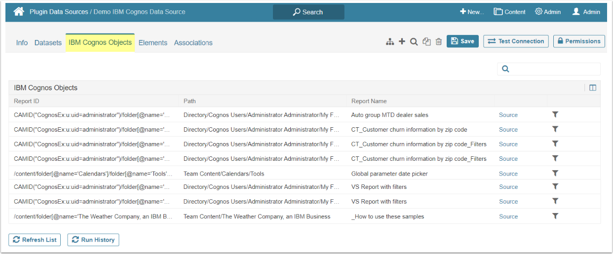 Access Admin > Collection & Storage > Data Sources and click the IBM Cognos Data Source Active Name link to open the Data Source Editor