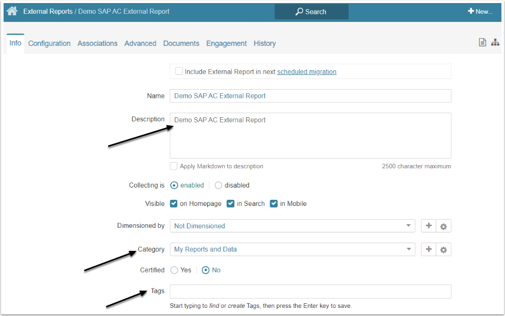 For SAP Analytics Cloud, the system pulls Descriptions, Tags, and Category metadata during synchronization.
