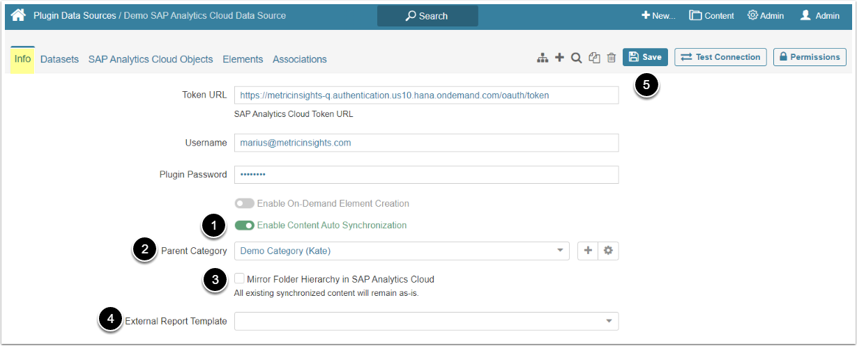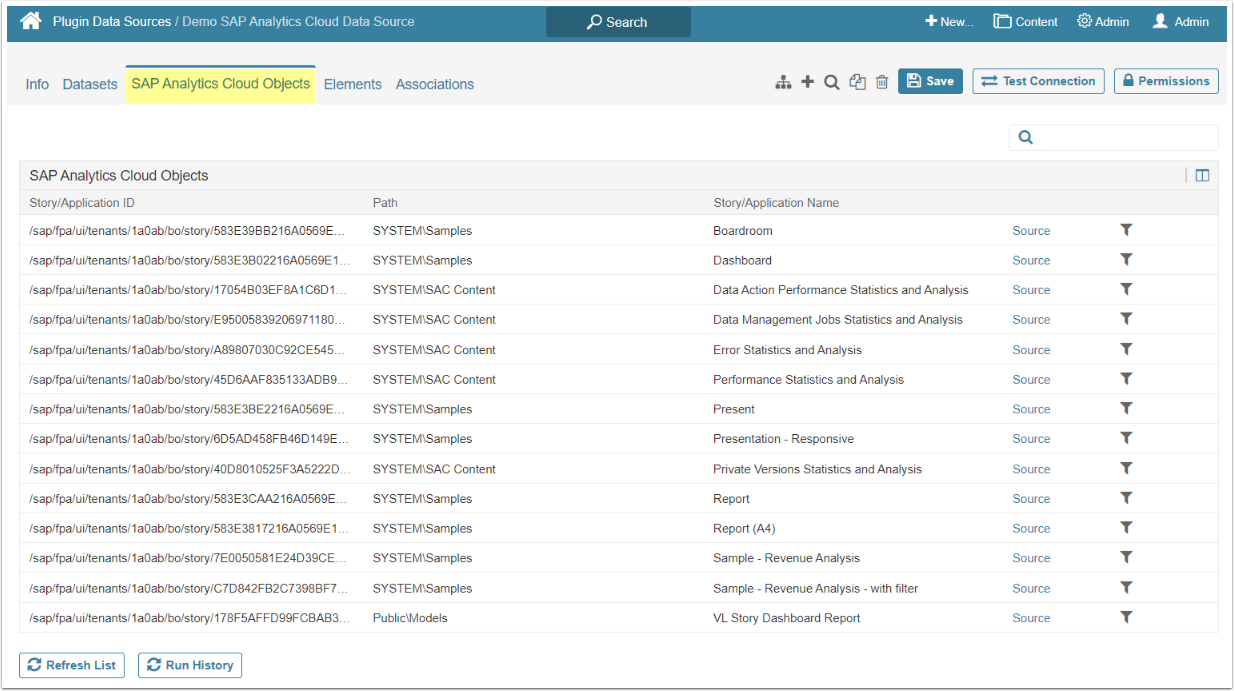 Access Admin > Collection & Storage > Data Sources and click the SAP Analytics Cloud Data Source Active Name link to open the Data Source Editor