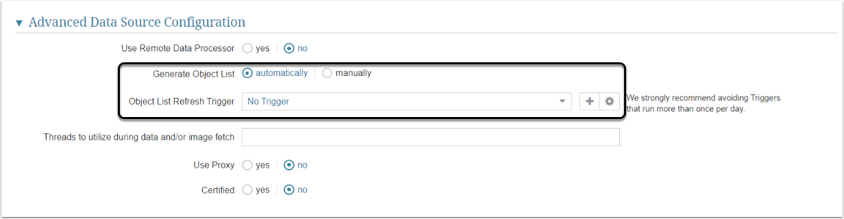Generate Object List defaults to "automatically" and requires you to to choose Object List Refresh Trigger from the drop-down below.