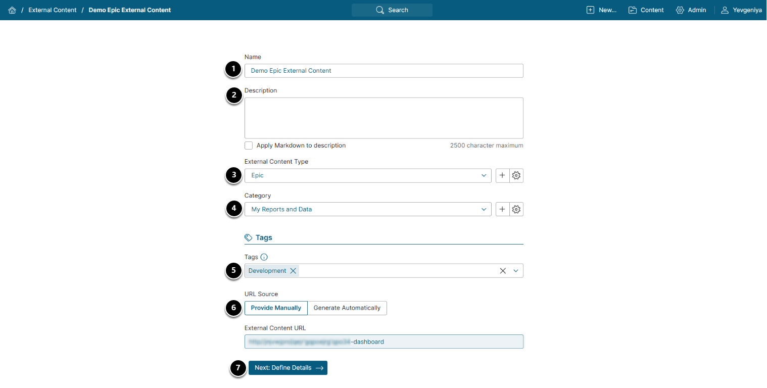 URL Source: Set to "Provide Manually":- External Content URL: Paste the copied Epic Hyperdrive link into this field.