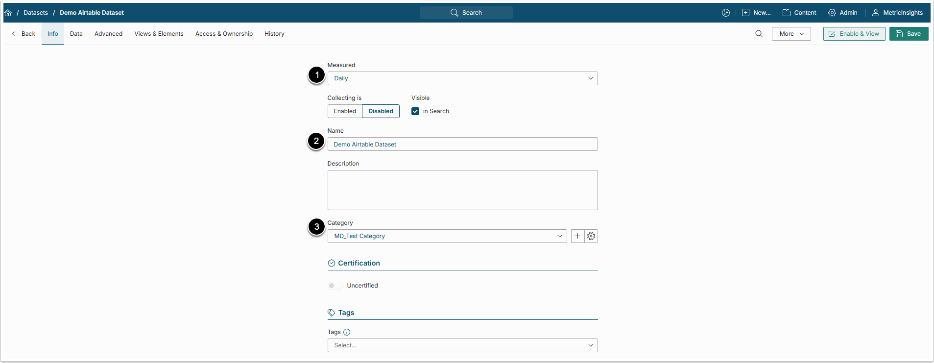 - Category: Specify the Category to place the Dataset.