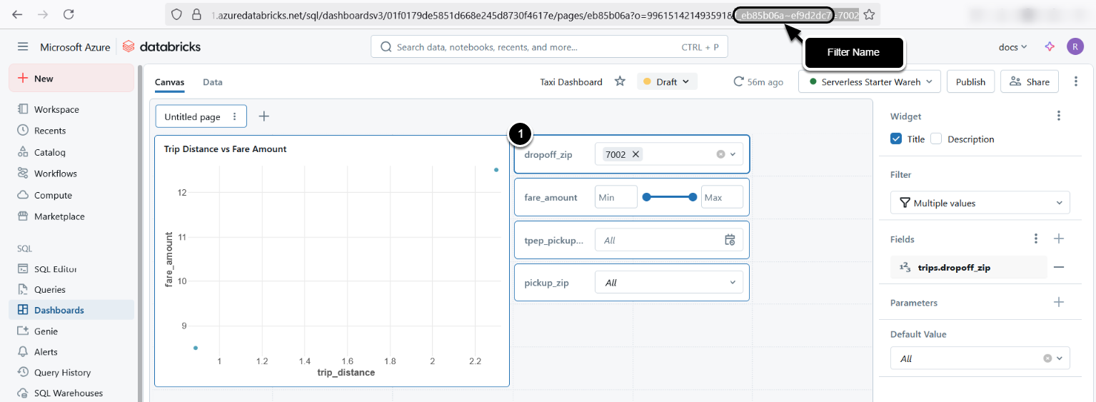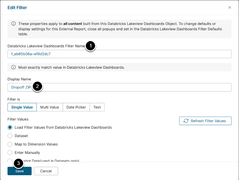 - Set Databricks Lakeview Dashboards Filter Name to the Filter Name from Databricks- See Where to Find Filter Name Value in Databricks for details