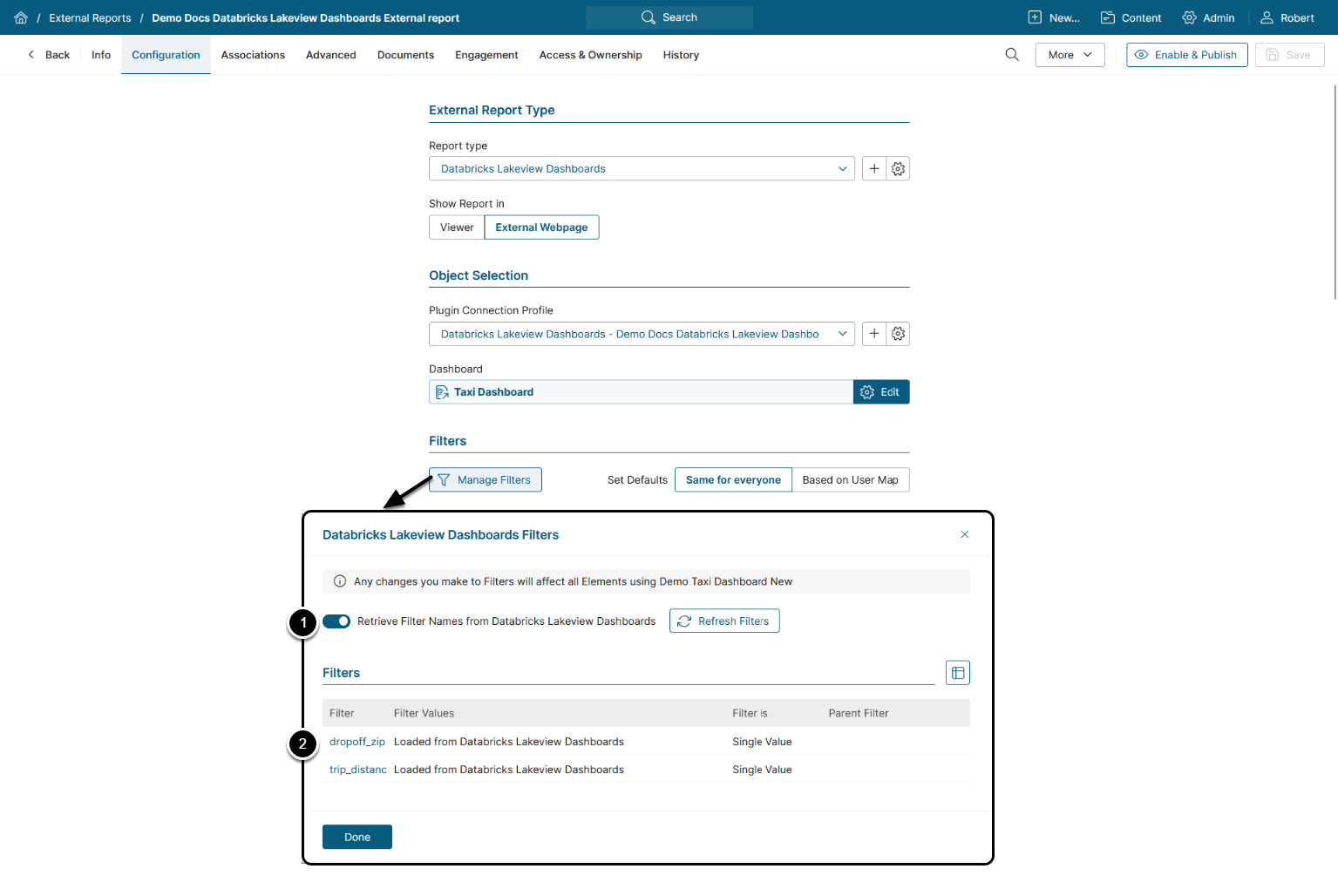 This article describes how to set up filtering for External Reports sourced from a Databricks Lakeview Dashboards Data Source.