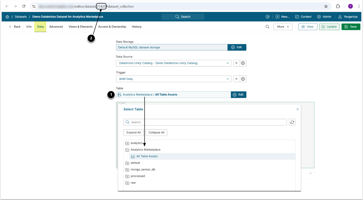 - Data Source: select the Data Source used as Data Storage when creating Dataset from the Databricks Unity Catalog All Table Assets object;