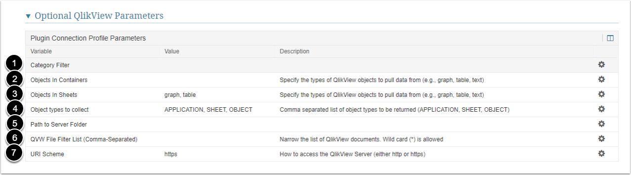 | 1 | Category Filter | Specify the names of QlikView categories (comma-separated) to pull data from these categories only (e.g., Financial, Social). Wild card (*) is allowed. (e.g., Fin*, S*). |