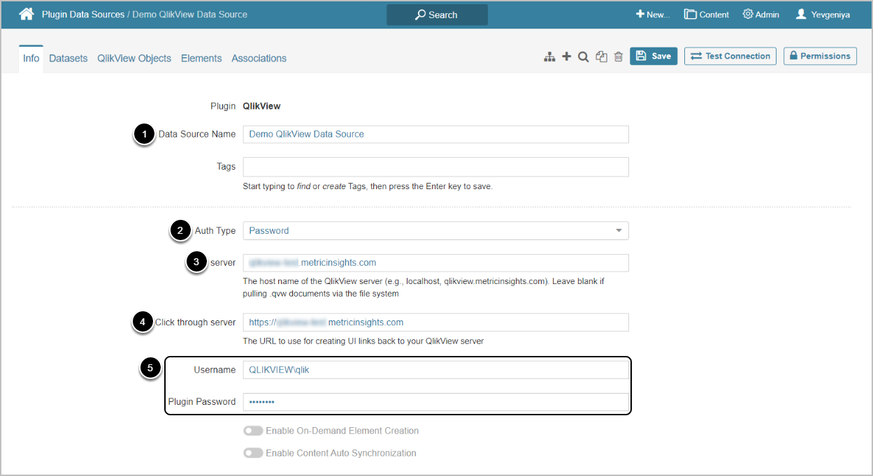 - Provide Username and Plugin Password- Note that your Username must be in the same format that your QlikView server uses for Authentication. For example, if Active Directory then you typically include the Domain like: <Domain>\<Username> (e.g., corp\edun)