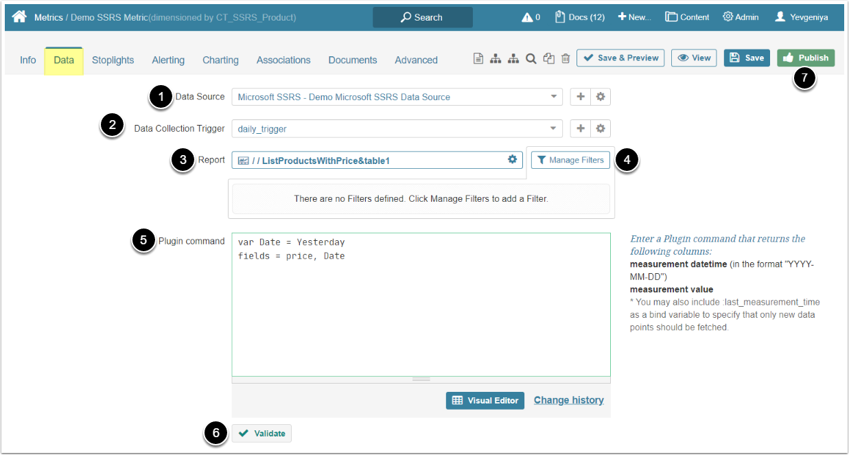 - Construct Plugin command that should list the data you would like to include into the Metric (manually of via the Visual Editor)- Note that Metrics represent time series data, so one of the columns must contain dates.