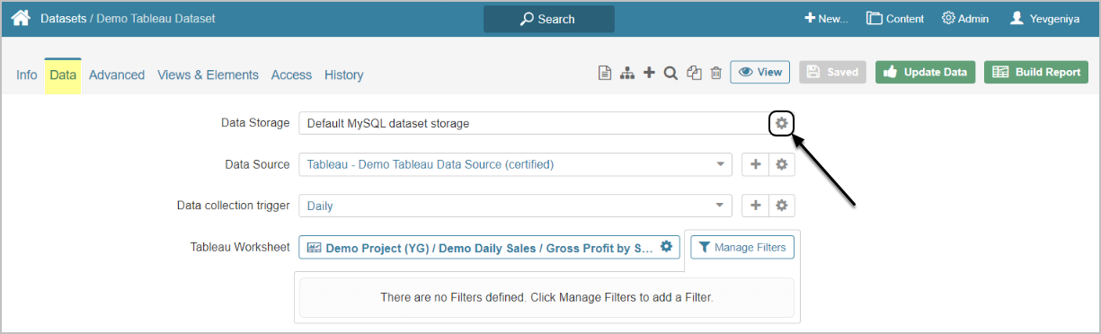 [6.3.1] Datasets can be moved between the available Data Storages. The screen below shows Tableau, but the functionality is essentially the same for all Plugins.