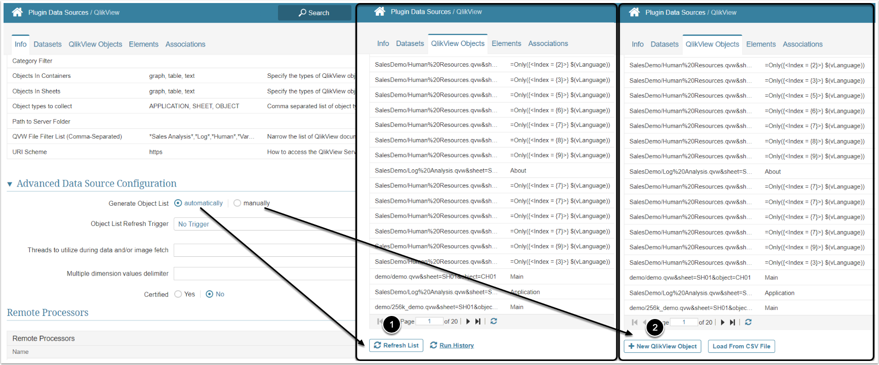 - Automatically: If the Generate Object List field is set to 'automatically', go to the QlikView Objects tab and simply click Refresh list to collect all QlikView reports currently available at the server