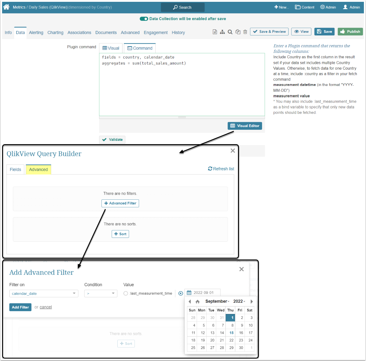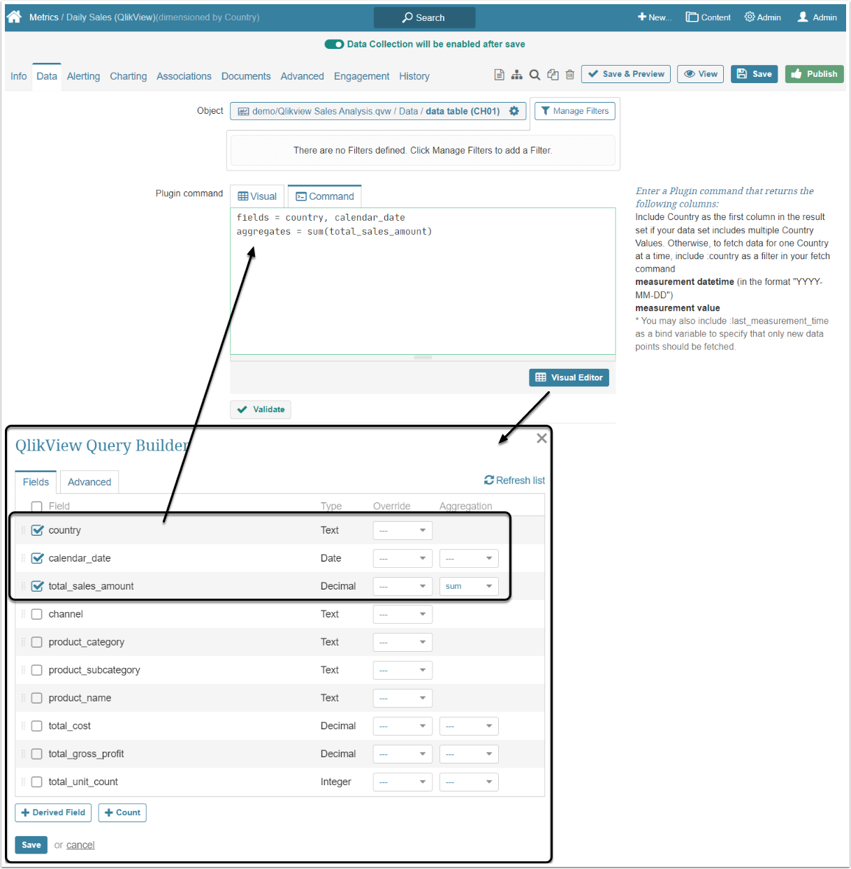 The check-list with fields available for constructing a plugin command is automatically captured from the reports and displayed at the QlikView Visual Editor located at Metric Editor > Data tab > below the Plugin command text box.