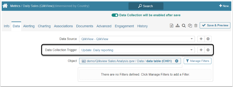 The data from the QlikView server can be gathered and fetched automatically. After setting a Data Collection Trigger the data collection will be performed periodically. For more information about Data Collection Triggers, refer to Create Data Collection Trigger article.