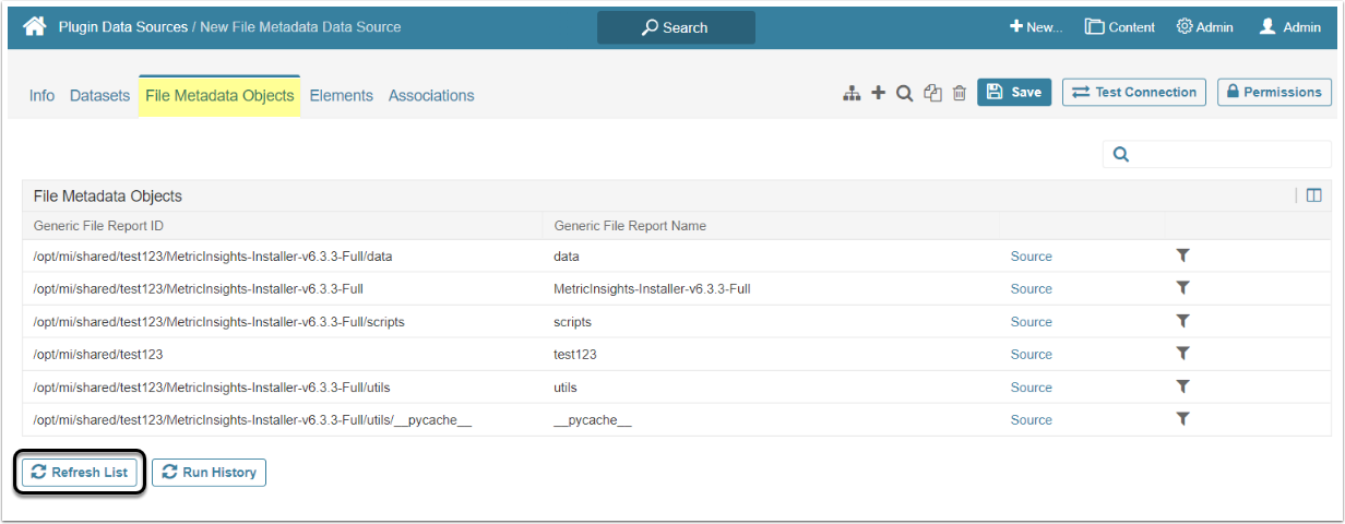In the File Metadata Objects tab, [Refresh list] to obtain a list of File Metadata External Reports.
