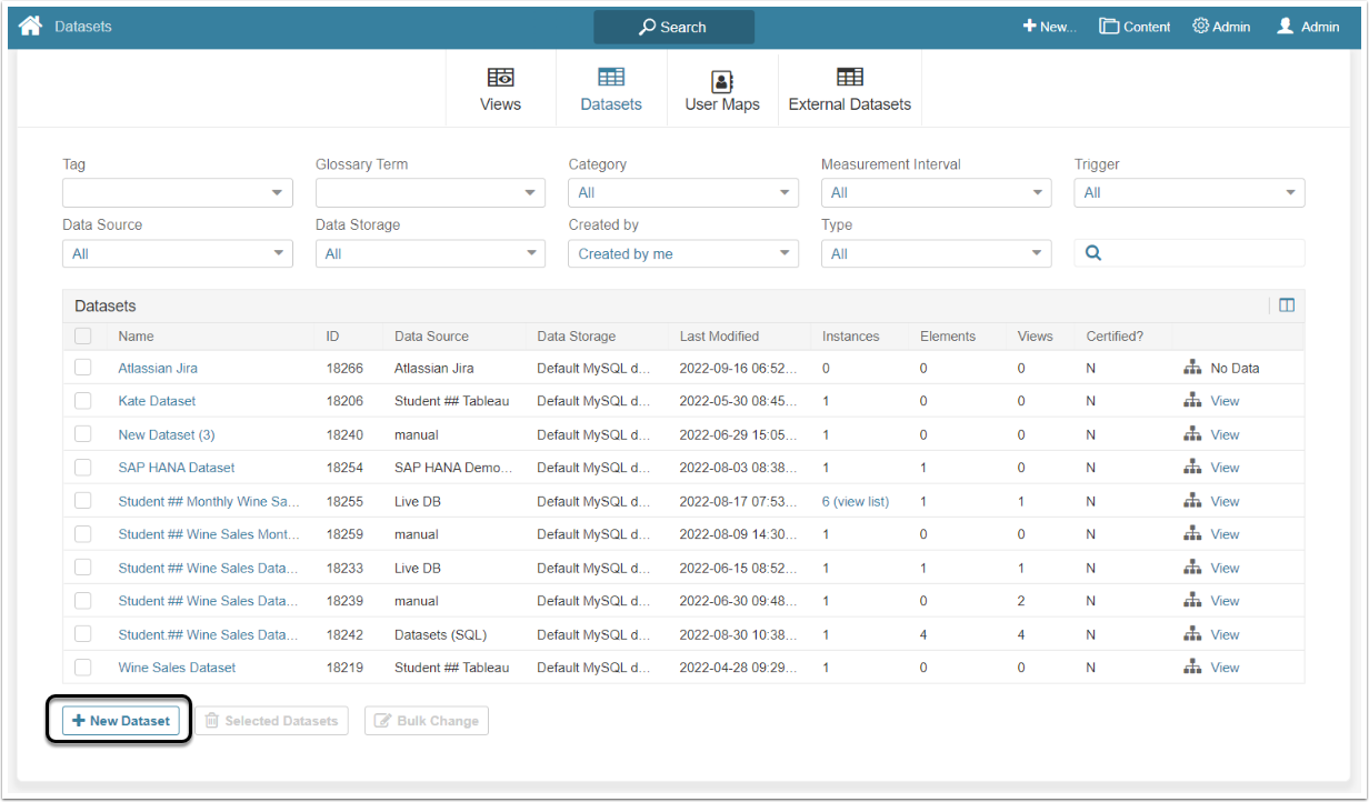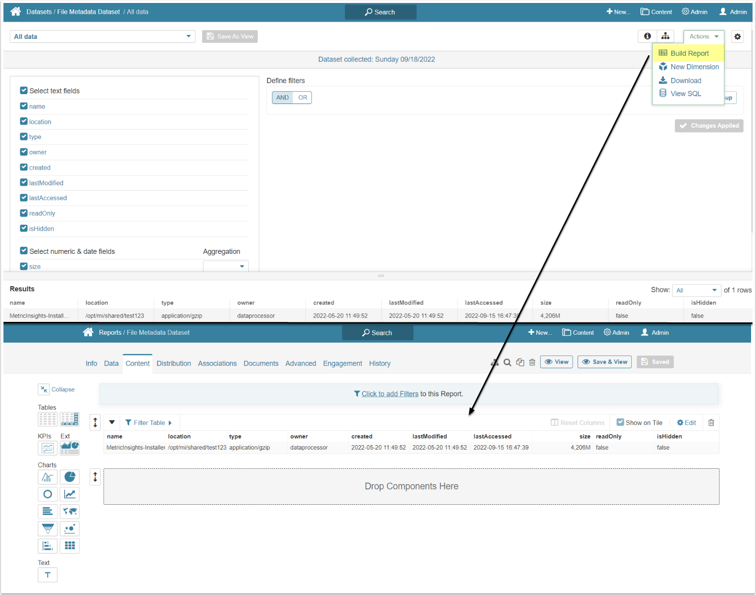 In the Dataset Viewer access Actions > Build Report. The Report Editor opens in a separate tab. For more information on Dataset Reports creation, refer to Dataset Reports Overview.