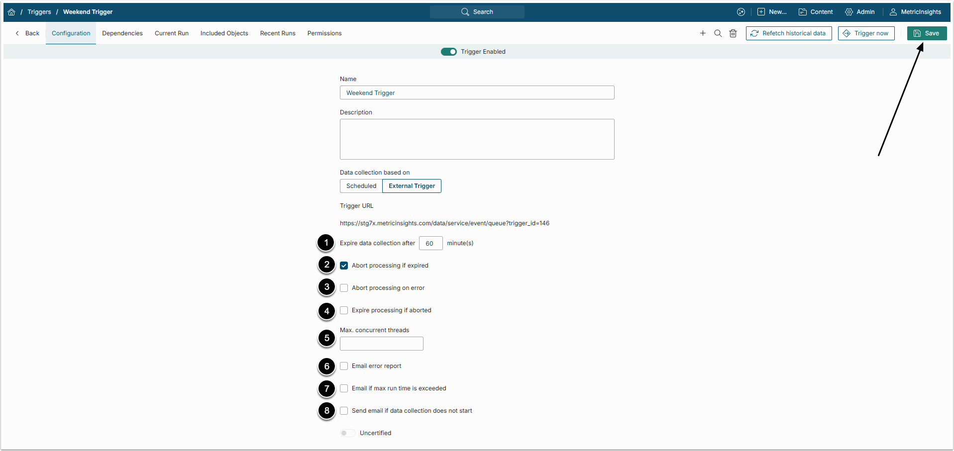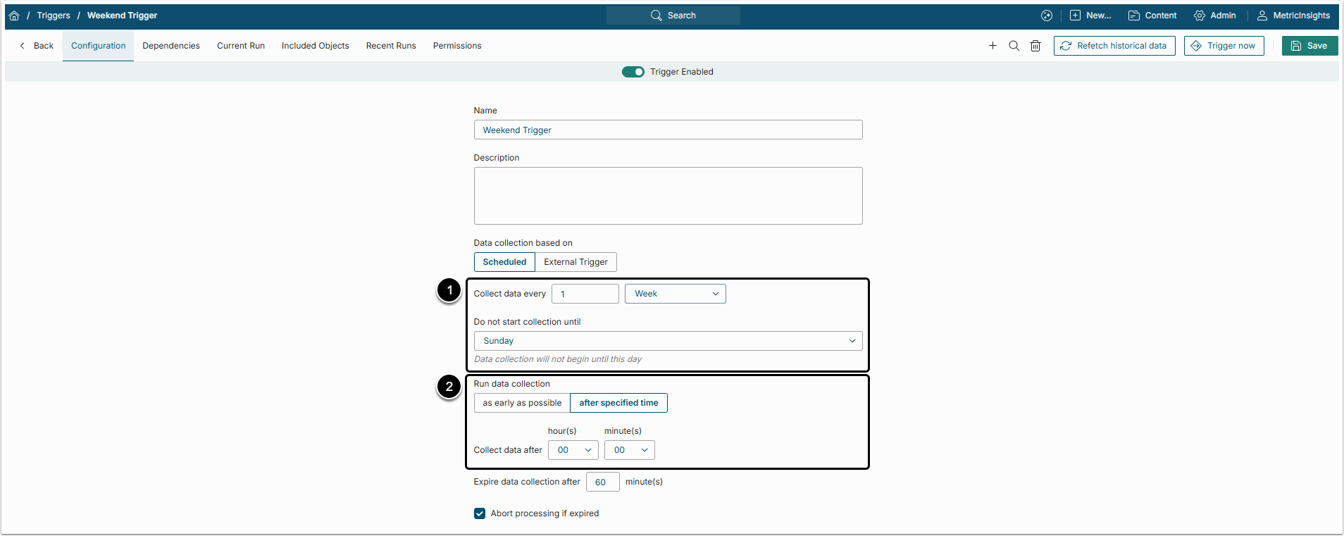Expire data collection after: If the Trigger won't finish working after a time period set in this field, it will be marked as "expired".- NOTE: Make sure this time period is reasonable for the number of Elements which uses it.