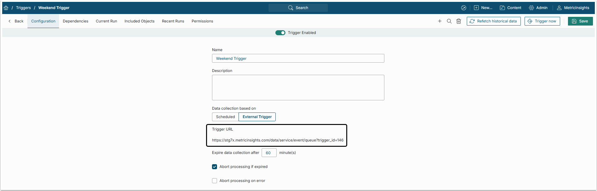 From MI system, the Administrator can make the Trigger start working, but until it finishes, there is no way to know what's happening to it. If it is taking too long to finish, it can be marked as expired. The Administrator can also stop Trigger processing by clicking [Abort Now] in the Current Run tab. However, this doesn't mean that the process will be aborted immediately. The Trigger will finish updating the current Element and stops before starting to process a new one.