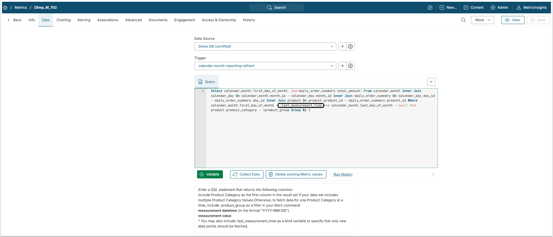 If you want to re-fetch data going back a certain number of days before the last measurement time collected, you can do so by setting an offset in the Data tab of the Metric Editor. This offset will be applied to the last measurement time associated with the metric to determine the :last_measurement_time substitution variable.