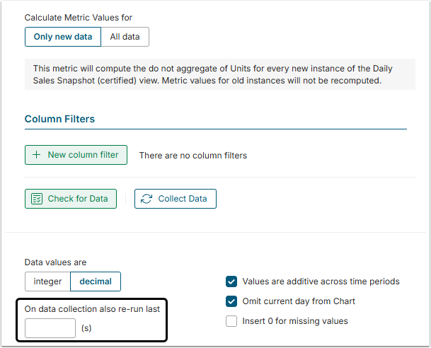 NOTE: The On data collection also re-run last field shows up only if the data is collected from the Dataset, that Dataset is snapshotted and Calculate Metric Values for field is set to "Only new data".