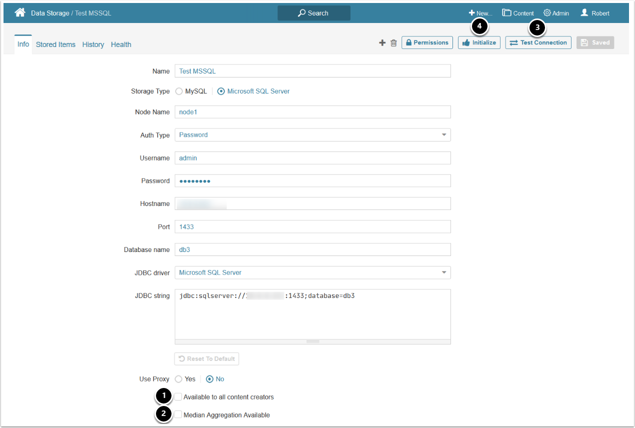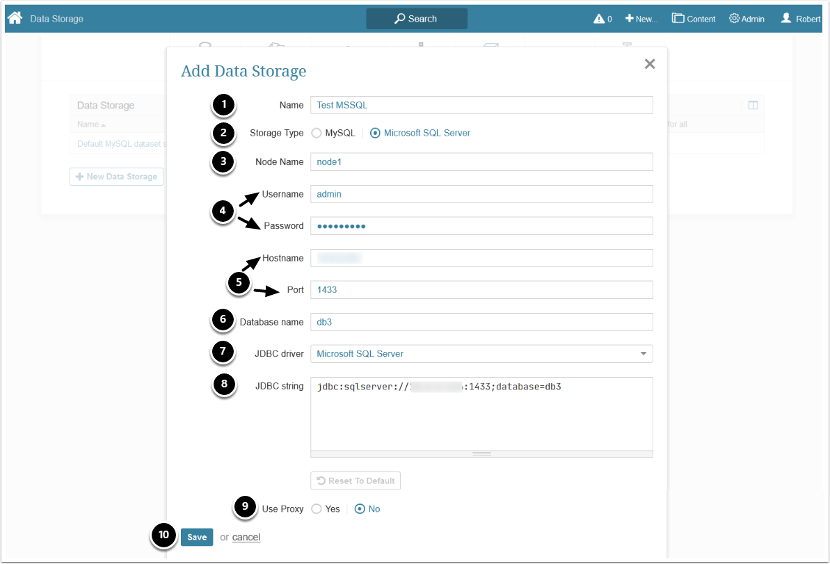 - JDBC string is generated automatically based on the options you have selected for the Data Storage