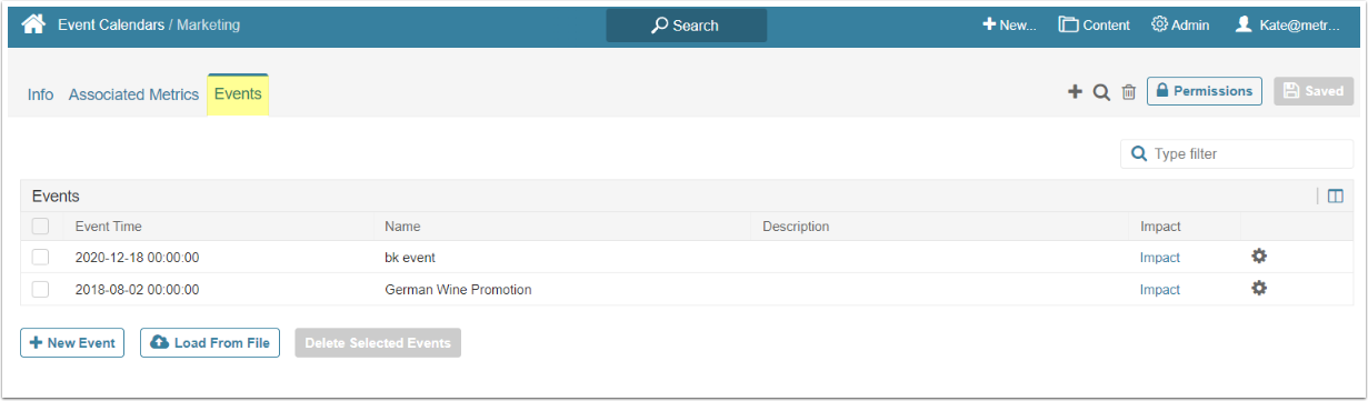 Events are organized into Event Calendars that are associated with one or more Metrics. Events may be added to an Event Calendar in advance for scheduled items such as system maintenance or sales promotions. Alternatively, Events may be entered after the fact for occurrences, such as storms or system outages. The Events feature is structured into three parts: