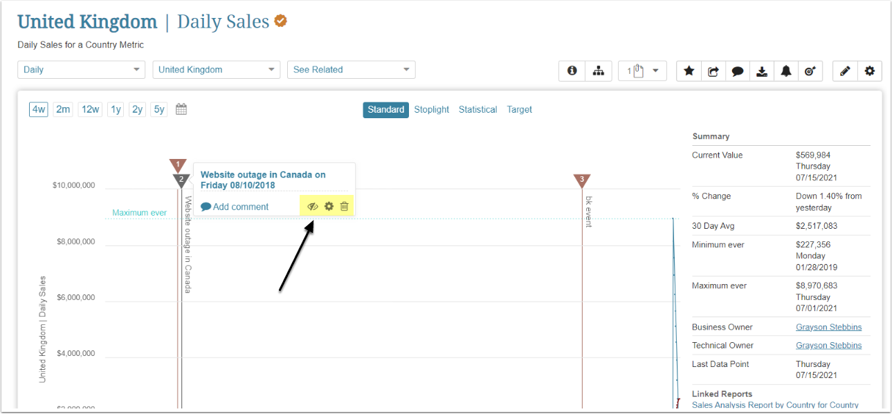 - Events: One or more individual occurrences associated with the specific Event Calendar. Events will display on Viewers of those Metrics for which the Event is determined to be "Impacting", for example: If the value(s) for a date or range of dates are "Statistically Significant"; (outside of the Standard Deviation settings), the Event is considered to have impacted the result