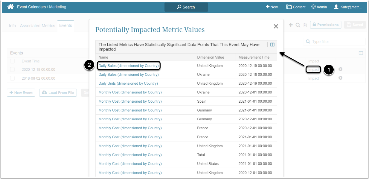 - Select an Event from the list and click Impact to see the Impacted Metric Values (if any):- Event Impact: is automatically calculated by the allowed standard deviation in the Statistical View. Standard Deviation is assigned in the Metric Viewer > Charting tab > Set Statistical view field. When the data point falls outside the statistically acceptable threshold, system interprets it as an Alert. If such Alert date coincides with the date in the Event Calendar, this Event becomes impacted and current date and the following date are added to the Potentially Impacted Metric Values list.