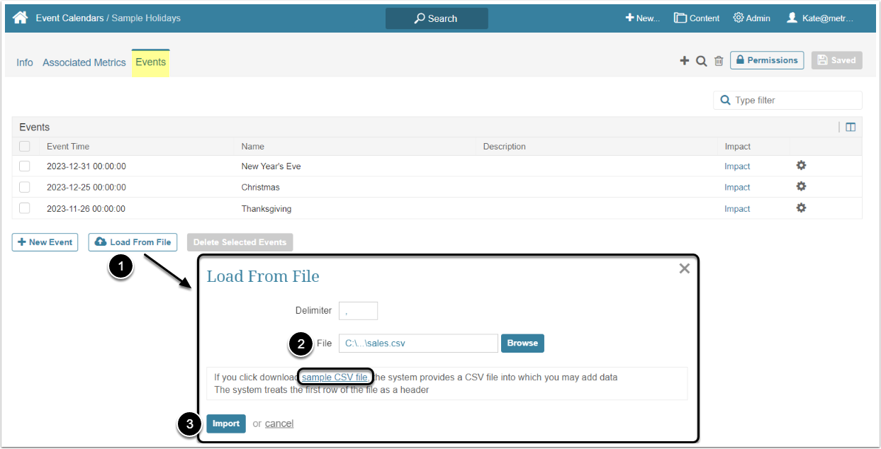 NOTE: If you want to enter Events into a CSV file and you are unsure about its format, click sample CSV file link to obtain a file into which you can enter data after saving it.