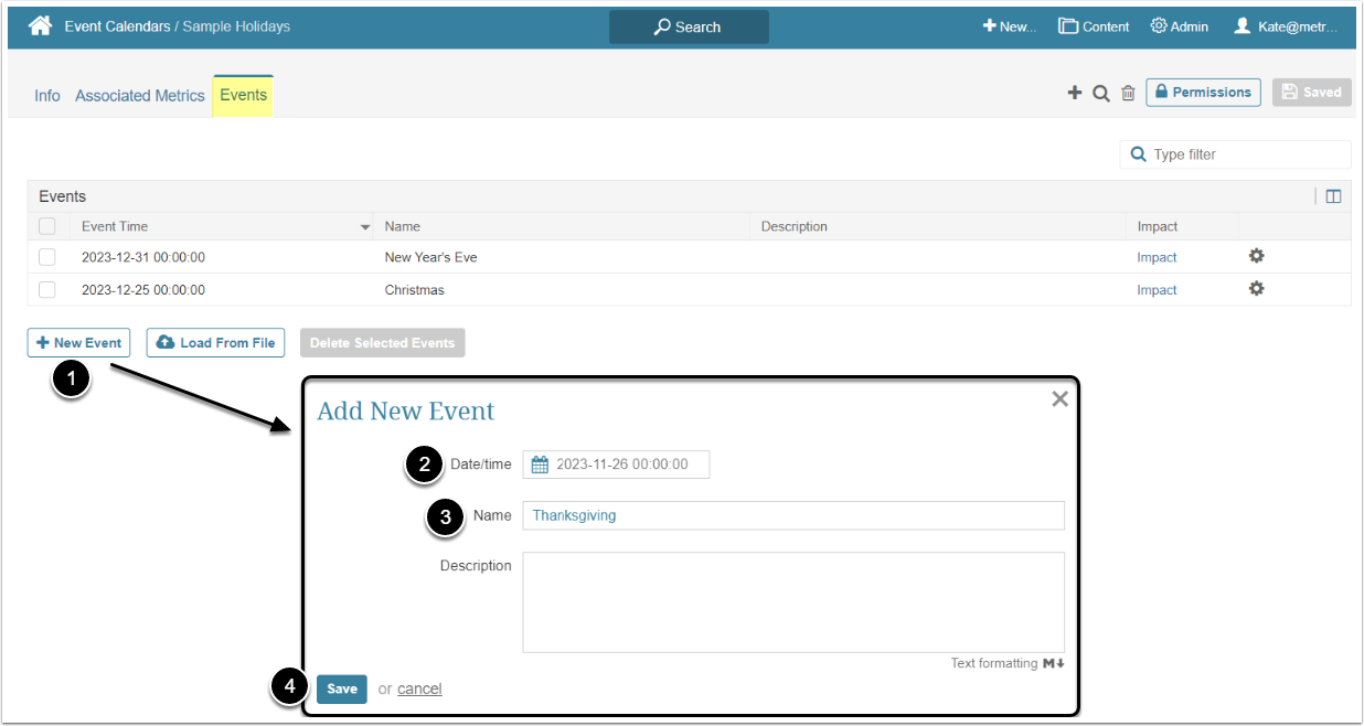 - Once you [Save] the Event, it is added to the Events table and is displayed on the Charts of Metrics associated with this Event Calendar.