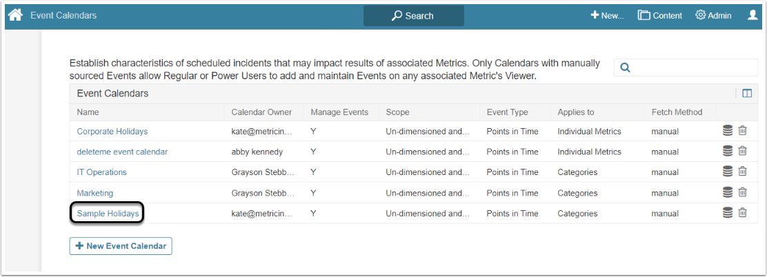 Find an Event Calendar inm the list and click its Active Name link.