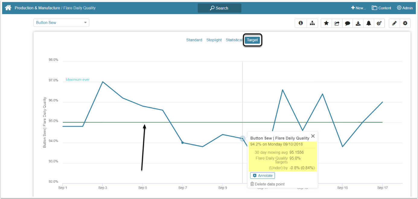 A Target is visible as a line on the full Metric View if there is at least one Target associated with it. To see it, open the Target tab.