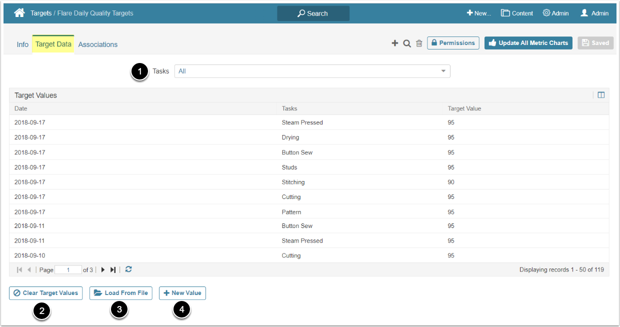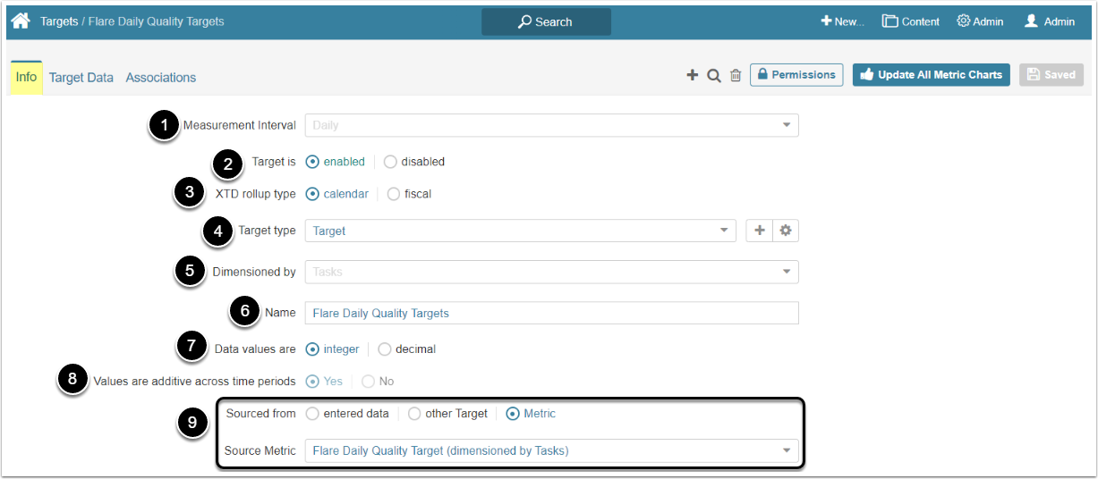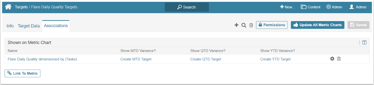 Targets can be applied only to Metrics. One or more Targets can be associated with any Metric. A Target may also be extended to include period-to-date (XTD) periods (for example, Month-to-Date, Quarter-to-Date) comparison vs Metrics.