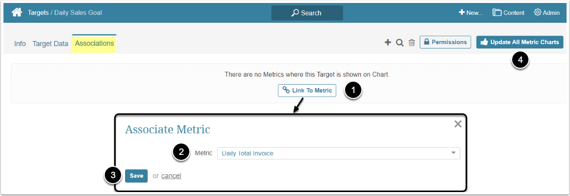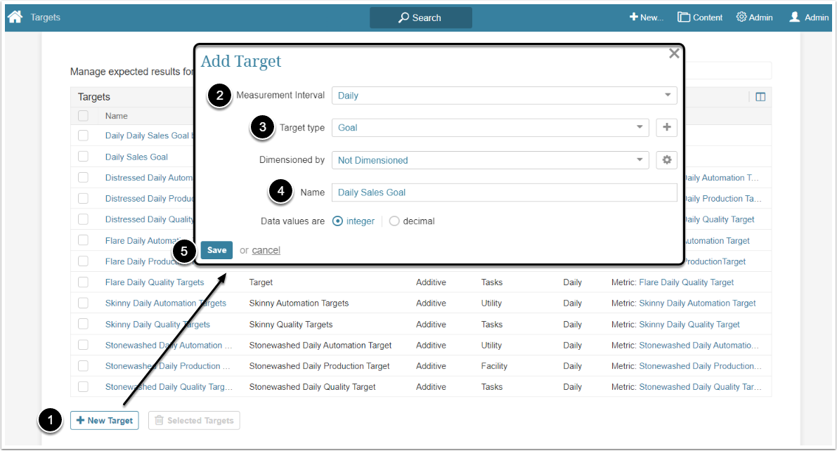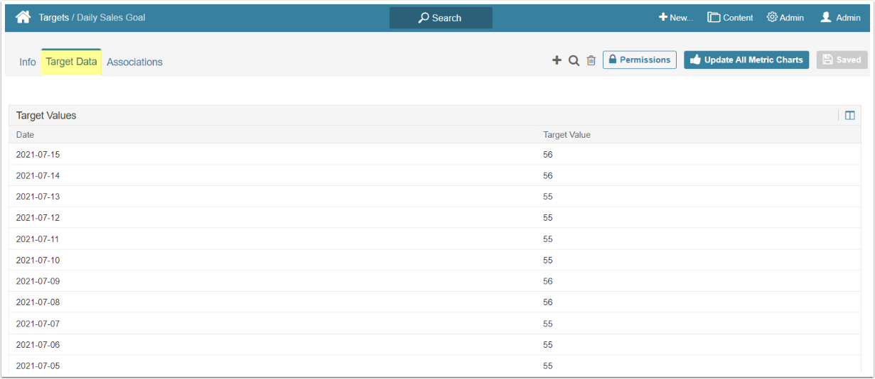 The Target can be populated with Values using a Metric. This Metric should have the same Measurement Interval as the Target. This article describes how to add Target Values using a Metric.