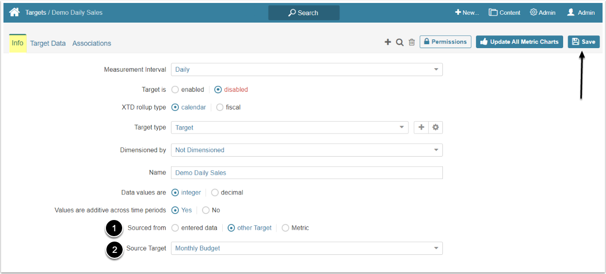 The Source Target drop-down list contains all other Targets with the same Dimensioned by settings as the current Target and with a Measurement Interval populated based on the mapping rules shown below