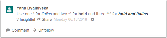 Use one \* for *italics* and two \** for **bold** and three \*** for ***bold and italics***