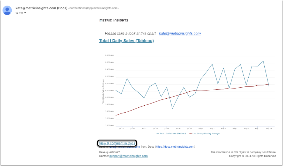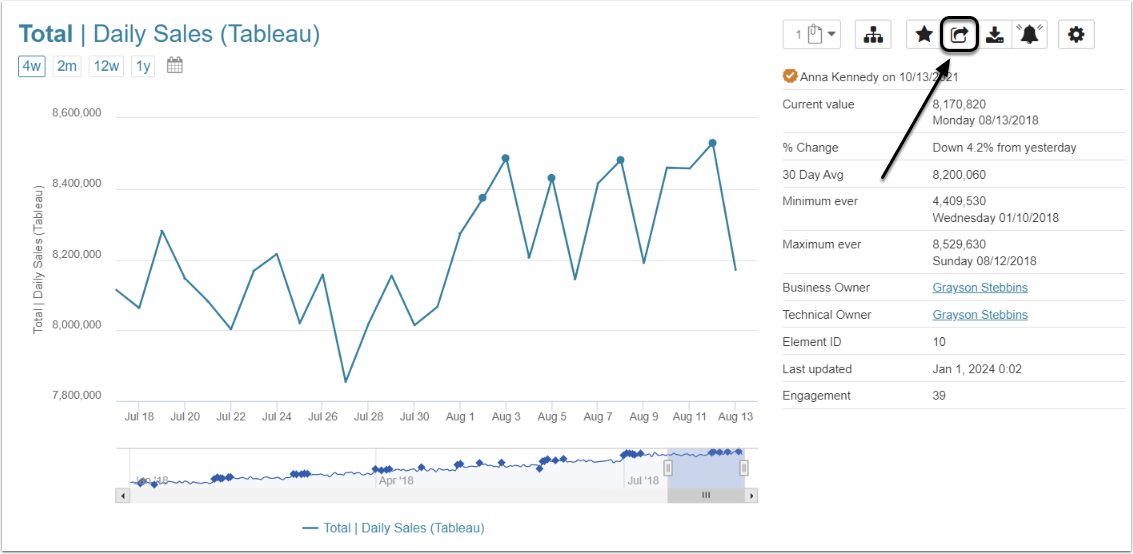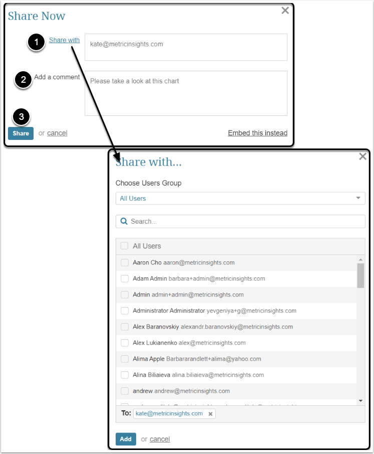 In Metric Insights, the User can easily share Tiles with other Users with the help of the share icon in the Tile Viewer. This article describes how to send a Chart or Report to other Users via the "Email this Metric now" button.