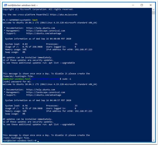 2. In PowerShell terminal for accessing Linux Subsystem run bash command and for switching to root user run sudo -i :