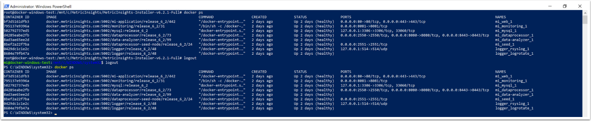 To check container statuses we can run docker ps command from PowerShell or Linux Subsystem terminal console: