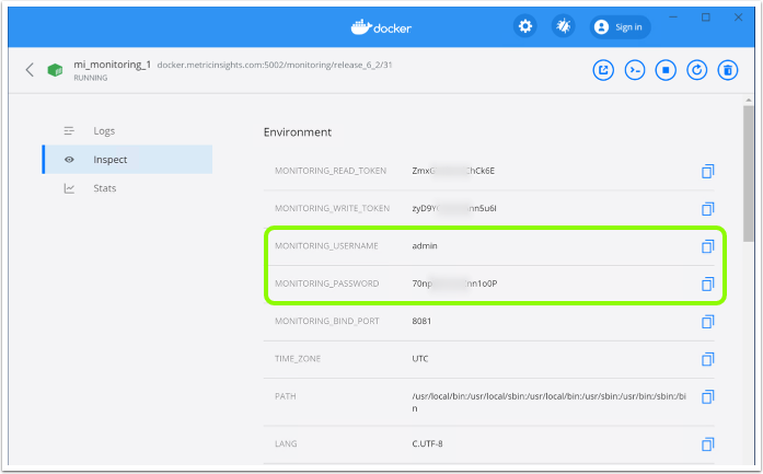 Note: username and password for Monitoring UI can be accessed from Docker Dashboard: